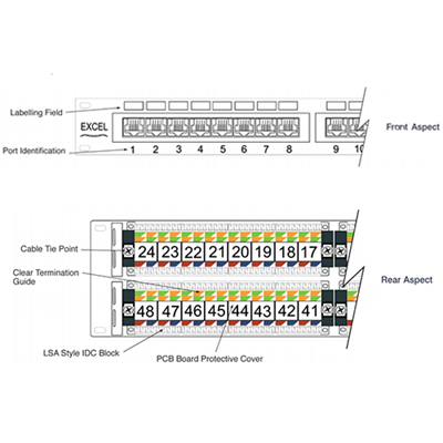The Excel 100-302 24-Port CAT6 Unshielded Patch Panel has been designed to meet or exceed the latest ISO and TIA requirements for category 6 compliance. Ease of installation is assured with built in rear cable management at a 90º angle to the panel fascia. This panel has a screen printed labelling field positioned above each port, and a pre-printed self adhesive labelling sheet (pre-numbered 1- 96) is included for fast and easy labelling on site. Termination can be made using LSA compatible tools, and cable tie bridges are positioned between the IDC blocks to relieve cable stress.