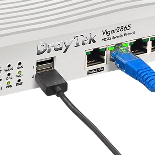 The DrayTek Vigor 2865 Dual-WAN ADSL+/VDSL2 Broadband Router is a VDSL2 35b/ADSL2+ Security Firewall Router integrating a DSL modem which is compatible with variants of ADSL and VDSL, including profile 35b supervectoring. There is also a Gigabit Ethernet WAN port for broadband connections to share the traffic load or serve as a failover connection. A 3G/4G/LTE USB modem (sold separately) can also be attached to the USB ports of the router.