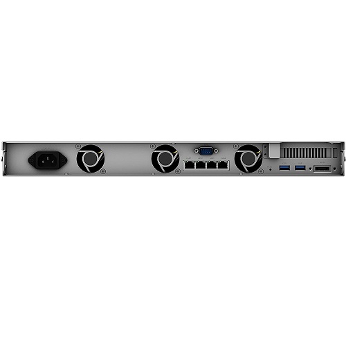 Synology RS820+/RS820RP+ is a 1U rackmount 4-bay network-attached storage solution designed for businesses requiring an effective and centralized data management. It is equipped with a 4-core processor and 2 GB DDR4 memory, expandable up to 18 GB. The PCIe 3.0 slot supports an optional 10GbE add-in network interface card, or an M2D18 M.2 SSD adapter card 4, where the M.2 NVMe/SATA SSD cache can be used to boost system random IOPS.