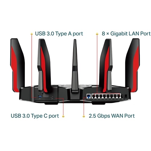 This TP-Link Archer AX90 Tri-Band WiFi 6 Router combines tri-band WiFi with high-tech WiFi 6 and provides eight simultaneous data streams to open up more bandwidth and help your devices operate at full speed. Eight high gain antennas not only deliver boosted WiFi signals to every corner of your home, but also bring a sense of aesthetics.